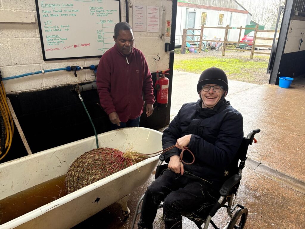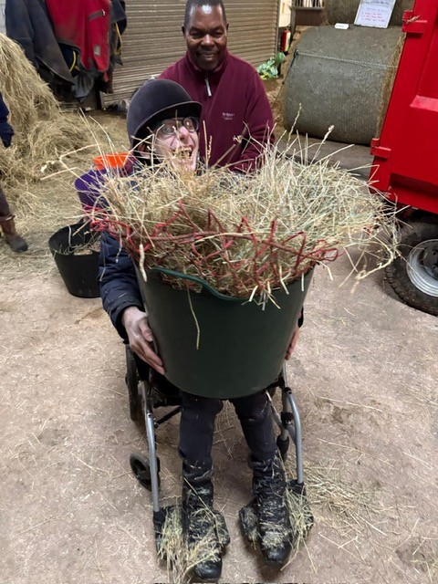 It’s not only about riding…. Matt embraces the opportunity to do groundwork with Diesel, in our new Horsemanship Area, as well as getting stuck-in, helping prepare haynets…. all while enjoying banter with his helpers! Never a dull moment when Matt’s around!